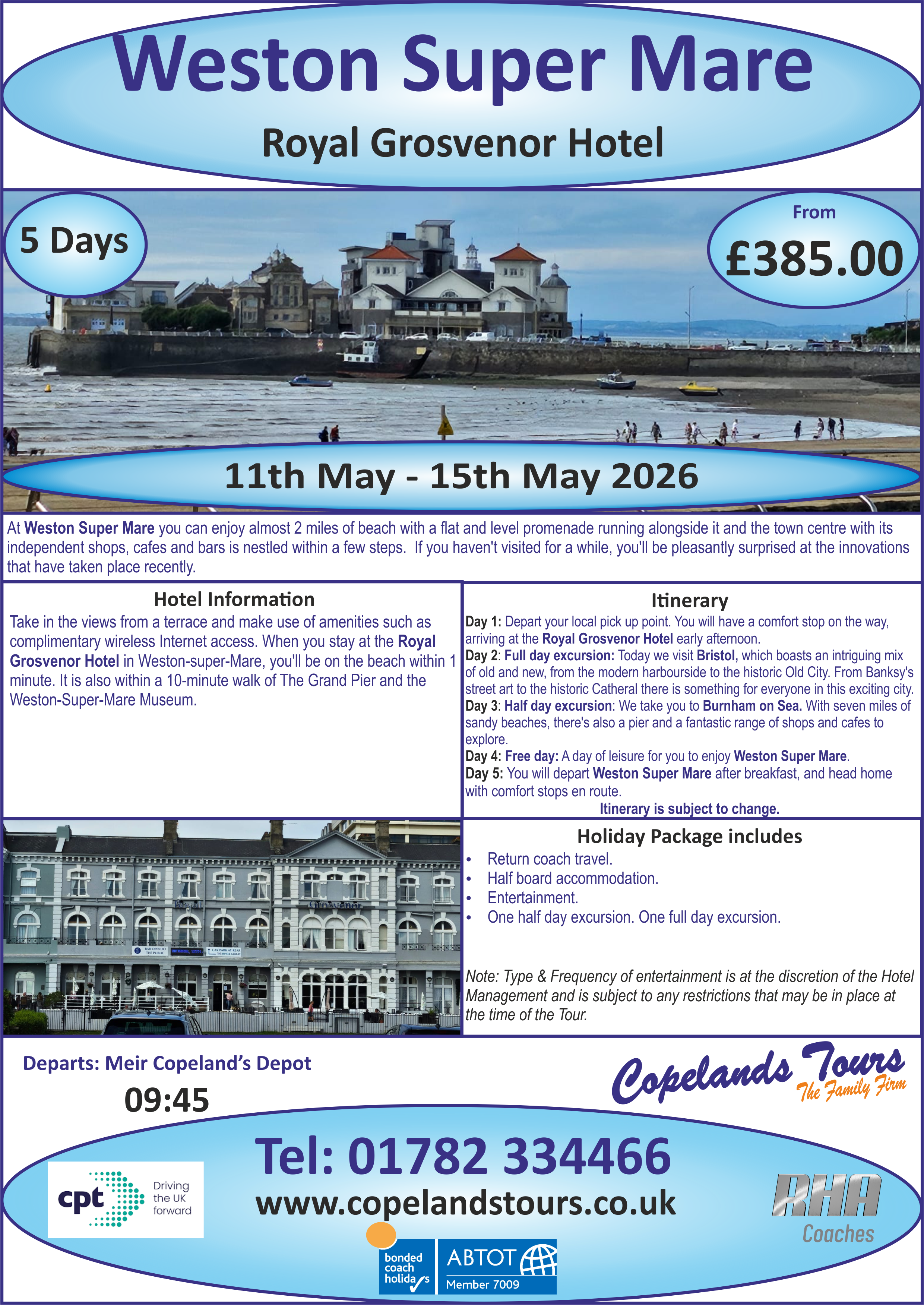 Copelands Tours are also proud members of RHA Coaches as well as the Confederation of Passenger Transport UK (CPT) the trade associations representing Britain’s Coach and Bus operators. Copelands Tours have been trading for many decades now and have always taken pride in the way we look after our customers. If you need holidays from the Stoke on Trent, Staffordshire Area, coach hire, day excursions, home to school transport, or just want to organise a day out for your work colleagues or group, then why not contact us now.